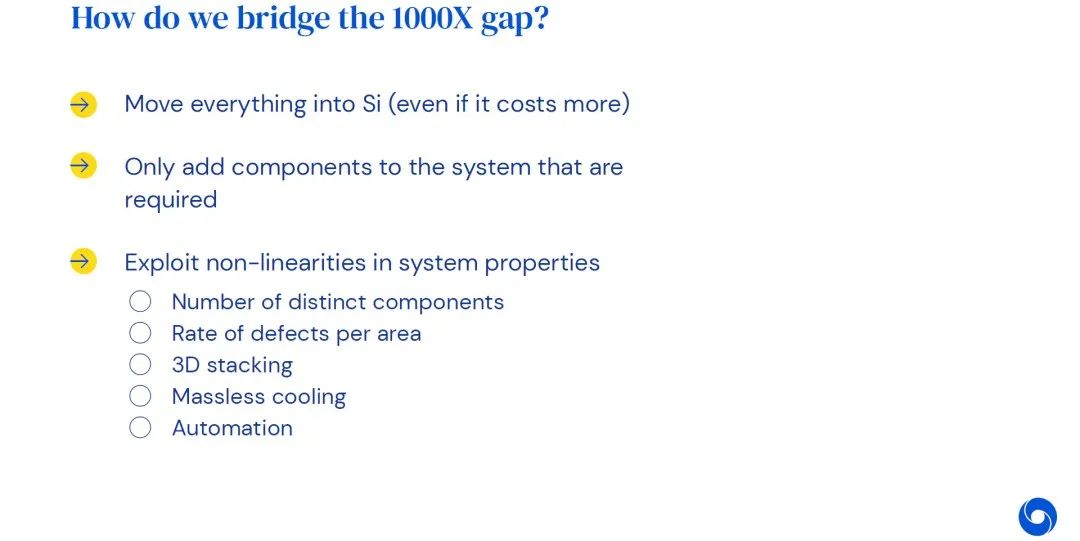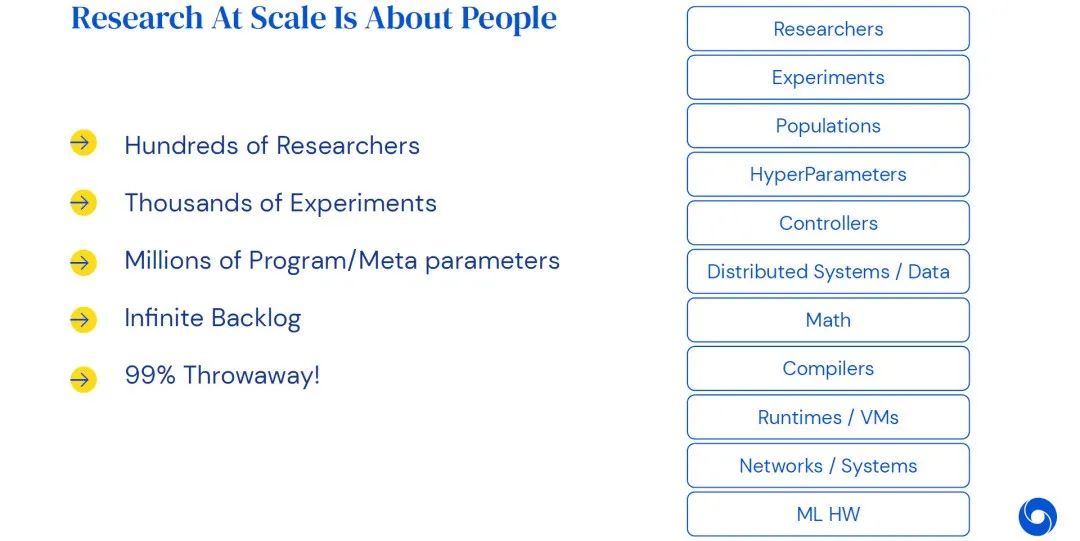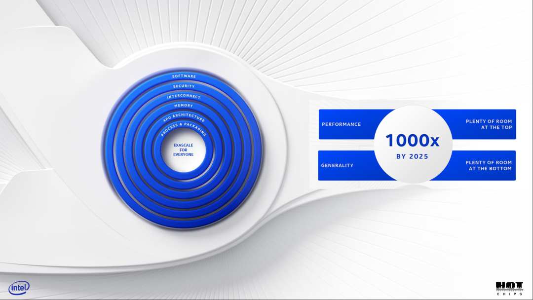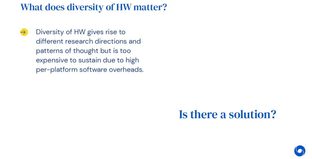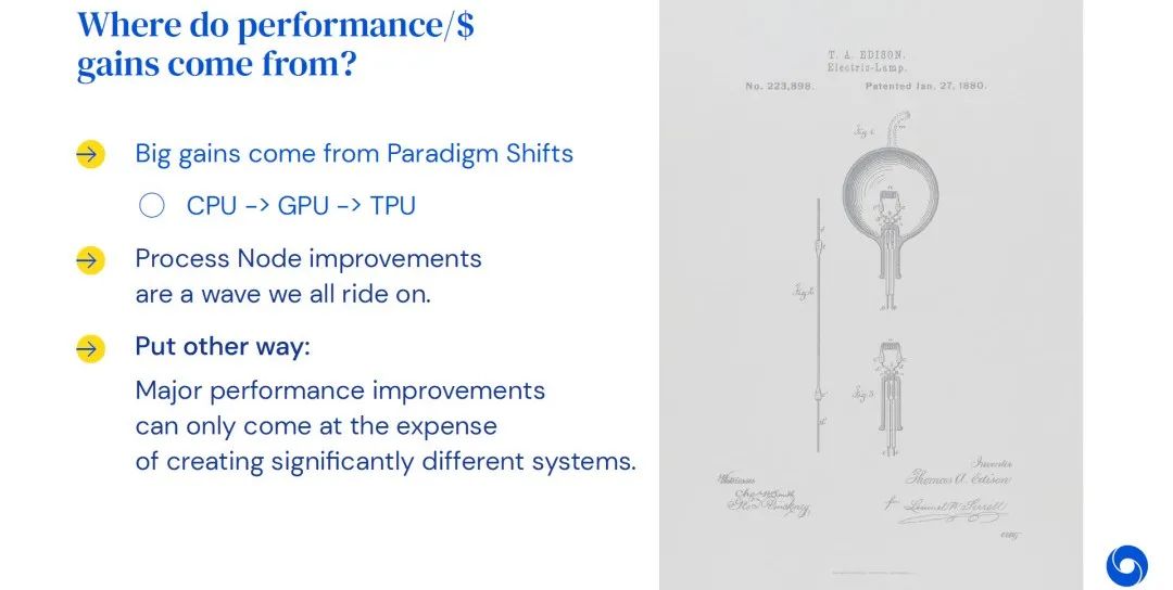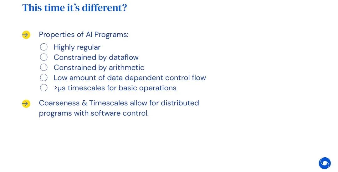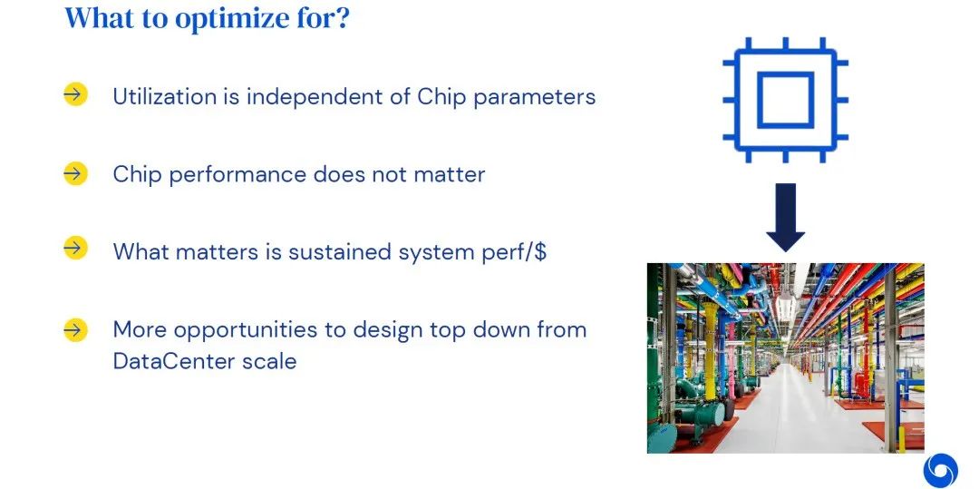我们还是先从芯片说起。Google的TPU已经开发了好几代了(最新的TPU4已经在MLPerf露了脸,「AI训练芯片巅峰对决,如何正确『围观』?」),今年的Hot Chips上也介绍了架构的演进「Google’s Training Chips Revealed: TPUv2 and TPUv3」(可以参考「Google TPUv2/v3架构及其设计演化」)。 而同样在Hot Chips上,Dan Belov的keynote,「AI Research at Scale - Opportunities on the Road Ahead」,从更宏观的角度分析了未来AI系统和芯片的趋势。 就在一天前,Raja M. Koduri在Hot Chips上介绍了Intel怎么实现到2025年把算力提升1000X,相信很多朋友都看过了,我就不多说了。 source: Intel@Hot Chips 2020 回到Dan Belov的keynote,同样在讲为了支持大规模AI研究,怎样实现1000X的算力提升。结合Google的背景,他很自然的强调系统而非单个芯片的优化,其中有一些观点值得我们思考。 source: DeepMind@Hot Chips 2020 首先是对大规模AI研究任务的总体优化目标的分析。根据他们的观察,优化最好的项目最多能够达到70%的利用率,而平均情况是只能用的峰值算力的20%,而造成这种情况的原因很多,包括硬件限制,比如memory和I/O;软件栈效率问题,比如编译器,python runtime的性能;还有任务本身的问题,比如Startup time,Contention以及Amdahl’s law等等。因此,只看单个设备的峰值效率(perf/$)意义不大,而解决方法是从数据中心规模做自顶向下的系统优化。 当然,我不认同「Chip performance」真的「does not matter」,应该说,除了芯片性能之外,还有很多其它需要优化的地方,或者说有能够优化的机会。source: DeepMind@Hot Chips 2020 从硬件角度来看,两个最重要的机会包括,「Move everything into Si」和「Paradigm Shift」。在第一个方向,我们是否可以期待未来出现Datacenter-on-Chip,Datacenter-on-Wafer或者Datacenter-in-Package?也许Chiplet和Wafer-Scale-Engine能够实现。 进一步看所谓「Paradigm Shift」,它会带来巨大的收益,同样也意味着着我们必须付出巨大的代价,即需要设计「significantly different systems」。由于整个软硬件基础设施的复杂性和不灵活性,要进行「Paradigm Shift」当然不是说说这么简单。source: DeepMind@Hot Chips 2020 同时,硬件的多样性也会带来很大的软件移植开销。 source: DeepMind@Hot Chips 2020当然,好消息是,AI应用本身的特征,在一定程度上简化了问题。到此,其实就是我们这几年面向AI应用优化系统和芯片的一个基本逻辑:应用的需求驱动计算范式的转变,而应用的特征使这种转变成为可能。这后面Dan Belov还给出了一些其它的机会,比如编译技术(MLIR)和把AI用于编译优化等等,感兴趣的朋友可以去看看,我就不赘述了。