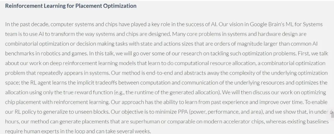 我这几年一直有一个观点,就是AI芯片的热潮带来很多side effect,大大促进的相关技术和产业的发展。Google在做TPU的过程中,除了芯片和软件栈(XLA/MLIR等等)的探索,也涉及到了芯片设计工具和方法学。 首先是一个大家可能都听过的新闻:「Google用AI设计芯片」。当然,这个说法有很多夸大的成分,这项工作更准确的说法是「Reinforcement Learning for Placement Optimization」,即用增强学习的方法进行布局(芯片设计流程中的后端设计的一个任务)优化。Jeff Dean在今年的ISSCC专门介绍了这项工作。 source: Jeff Dean@ISSCC 2020 关心更详细信息的朋友可以去看看[3],有这个项目的开发者的讲解和相关讨论。 source: Azalia Mirhoseini and Anna Goldie @DAWN event1 作者Azalia Mirhoseini之前就尝试用增强学习来优化计算系统里的任务分配(Hierarchical Planning for Device Placement),我在之前的文章(ML + System = ?)中也提到过。这项工作本身只是解决芯片后端布局布线中的一个问题,并不像宣传的那么夸张。 但这个工作是近几年「把AI用于EDA」这个大愿景里面的一个比较成功的例子,再加上Google的背景,所以受到很大关注。我还记得之前在一个EDA学者群里,对这项工作有过很热烈的讨论。当然,不管大家怎么评价,Google应该还是会继续探索下去。毕竟Jeff Dean已经说了「Anywhere We're Using Heuristics To Make a Decision」都是机器学习的用武之地。 第二个可能会对芯片和EDA产业产生更深远影响的是Google所作的Cloud EDA尝试,这个我之前做过一个简单的分析,「为云而生又生于云中的芯片给我们的启示」。这中间的一个核心实践是利用cloud上近乎「无限」的资源进行芯片验证,可以大大加速芯片开发的时间,这可能也是TPU系列芯片能够相对快速迭代的原因之一。Cloud EDA最近的关注度也很高,下面这张slide,介绍它的优势,来自Chips Alliance最近的一个workshop。source: Dan Ganousis, Metrics@CHIP Alliance workshop 最近,我的一个在EDA公司工作了十多年的前同事加入Google Cloud,做相关工作,这可能也是Google的系统性优势的一点体现吧。总之,在Cloud EDA方向,Google的推动值得关注。 除了Cloud商业项目,Google还非常积极的参与了开源EDA的工作,是CHIP Alliance的发起者。相信大家都关注到Google和Skywater的开源PDK项目,以及Google支持的免费投片。此外还有例如RISCV-DV的开源项目,有兴趣的读者可以看看最近的Chip Alliance Workshop。source: CHIPS Alliance Workshop - September 17, 2020