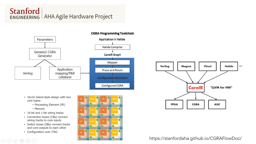 下面要介绍的开源项目CIRCT时间不长,相对也小众很多,不过很有意思,值得关注。 严格的说,这个项目并不是Google主导的项目,但却和Google发起的MLIR项目关系密切,也是MLIR Ecosystem的一部分。大家知道,MLIR是Chris Lattner在Google发起的编译器项目,我在之前的文章中也多次提到。Chris Lattner之后离开了Google,加入SiFive,并对硬件设计产生了极大兴趣,因此发起了CIRCT项目。CIRCT的基本思路就是利用MLIR/LLVM中的编译器技术和基础设施来改进硬件设计语言和工具(特别是开源工具)。 我们知道,EDA工具的目标是产生可生产的芯片设计。一个芯片设计流程,一般从一个DSL(Domain Specific Language),比如System Verilog/VHDL这样的硬件描述语言开始;然后会经过几个抽象层次的变化(类似软件编译的过程);在每个层次需要进行相应的验证,层次间的转换需要进行等价性验证。这个过程中的几个要素:编程语言,编译技术,验证技术,并不是硬件设计独有,很多都是和软件领域相通的。CIRCT这个项目最有趣的地方是软件编译器的开发者开始关注硬件设计工具,而且是从DSL/IR/Compiler这个角度切入,肯定不会只是修修补补的工作。 在进一步讨论CIRCT项目之前,我们先看看另一个Google发起的项目XLS[5],这是一个高层次综合(HLS:High Level Synthesis)项目。HLS是EDA领域中学术研究比较多的内容,其目标是通过提升设计输入的抽象层次来实现算法/应用直接到硬件的自动化设计实现,从而提高芯片开发的效率,我在之前的一篇文章中(在体系结构黄金期,ESL设计方法学能否「焕发青春」?)简单介绍过这个方向。 首先,这个项目自己定义了一个DSL来描述硬件。这里使用了类似Rust语言的DSLX。此外,XLS项目设计了自己的IR和编译工具,验证工具(包括Logic Equivalence),最终生成Verilog语言,进入传统的芯片设计流程。其实,和XLS项目类似的HLS项目在EDA学术界挺多的。 由于HLS的抽象层次高于RTL级的硬件描述,不合适使用Verilog/VHDL来作为DSL的,一般会直接使用描述算法的C/C++这样的语言,但直接使用这些语言也有很多困难,这里就不展开讲了。最近几年,大家比较喜欢参考(或基于)有函数式编程特征的语言(Scala,Rust或者Haskell)来设计DSL,出现各式各样的语言([6]中就有「Golden Age of Hardware Description Languages」的提法)。 这也是吸取软件领域经验的一种方式,但目前还没有一种高层次的DSL能够真正成为主流。顺便提一下,Chisel语言(基于Scala)可能是近几年在硬件设计语言上最成功的尝试,但Chisel还是RTL层次的语言,并不是为HLS任务设计的。 另一个可以参考的学术项目是斯坦福的Agile Hardware Project[7]。其目标是自动化设计面向图像处理的CGRA(Coarse-Grained Reconfigurable Architecture),使用Halide作为DSL,自己定义的CoreIR作为中间表达,并在此基础上建立相应的工具链。 通过XLS和AHA的两个例子,我想强调的是设计一个好的DSL/IR系统对于一个特定领域的EDA任务是至关重要的。而目前的芯片设计工具和方法,主要还是围绕抽象层次比较低的Verilog/VHDL来建立的。除了设计和验证效率低的问题,对于软硬件的联合优化也非常不友好。这个问题并不是什么新问题,十几年前就有很多讨论,但到目前为止并没有太多的变化。 一些尝试,比如SystemC,Bluespec,都不怎么成功。这个现象有很多的原因,其中之一是设计DSL/IR和相应的编译器(包括验证工具)的门槛和成本很高。这有点类似于本文第一部分说的,我们要做面向“新的计算范式”的硬件,其软件栈开发的难度和成本很高。 这就回到我想讨论的CIRCT这个项目的意义:是否可能利用MLIR的多层IR的思想及其提供编译器基础架构来拉低建立一个DSL/IR系统和相应的编译器的成本?从而让我们有可能在芯片设计工具和方法学上做更多的创新。现在CIRCT这个项目还是刚刚开始,很难说能未来发展到什么程度,但它至少让我们看到更多的可能。 参考资料[1] Dan Belov, "AI Research at Scale - Opportunities on the Road Ahead", Hot Chips 2020[2] Jeff Dean, "The Deep Learning Revolution and Its Implications for Computer Architecture and Chip Design", ISSCC 2020[3] Azalia Mirhoseini, Anna Goldie, "Reinforcement Learning for Placement Optimization", Design Automation WebiNar (DAWN), https://duke-cei-lab.github.io/DAWN/event1[4] "CIRCT" / Circuit IR Compilers and Tools", https://github.com/llvm/circt[5] "XLS: Accelerated HW Synthesis", https://github.com/google/xls[6] Lenny Truong, Pat Hanrahan, "A Golden Age of Hardware Description Languages: Applying Programming Language Techniques to Improve Design Productivity", SNAPL 2019[7] "Stanford AHA! Agile Hardware Center",https://aha.stanford.edu/ AI Chip Listhttps://basicmi.github.io/AI-Chip/AI Chip Paper Listhttps://github.com/BirenResearch/AIChip_Paper_List