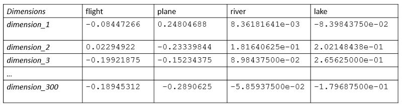 在单词表示系列的前一部分(第一部分)中,我讨论了关于不假设单词的语义(含义)和相似性的固定单词表示形式。在这一部分中,我将描述一个分布式单词表示方法家族。其主要思想是将单词表示为特征向量。向量中的每个条目代表单词含义中的一个隐藏特征。它们可以揭示语义或句法依赖性。在下面的示例中,我们看到300维的单词表示。我们可以到,“fight”和“plane”的向量值具有相似的值,且数值差异很小。同样,“river”和“lake”也有着密切的联系。