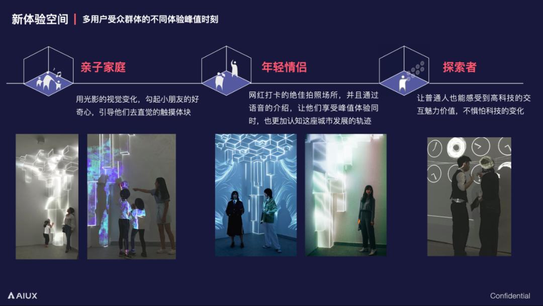 在这里给你分享一个我们 2019 年的空间体验案例。你能看到,当构建一个新的互动装置时,我们是如何逐层地通过感官和用户行为,来构建整个场域的体验设计思考的。