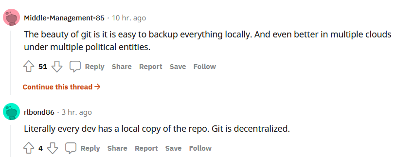 对此,有很多网友表示,好在GitHub的去中心化特征,开发者备份自己的项目代码很方便。