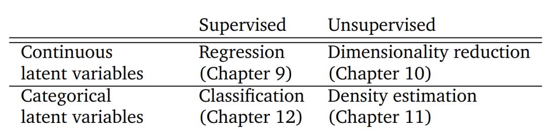 本书第二部分介绍了机器学习的四大支柱,如下表所示。表中的每一行区分了问题的相关变量是连续还是类别。我们解释了如何将本书第一部分介绍的数学概念应用于机器学习算法的设计中。
