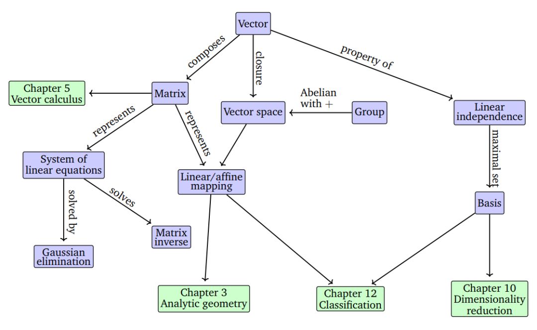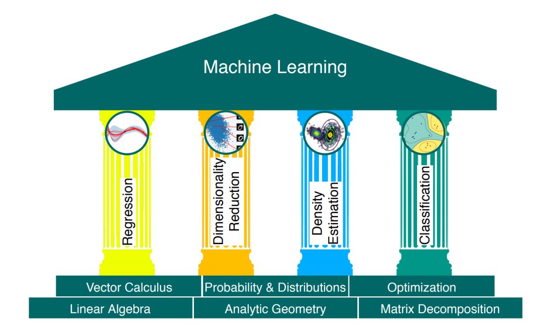 本书分为两部分,第一部分讲数学基础,第二部分将第一部分的概念应用于基本的机器学习问题中,继而形成了图 1.1 中阐述的「机器学习四大支柱」。