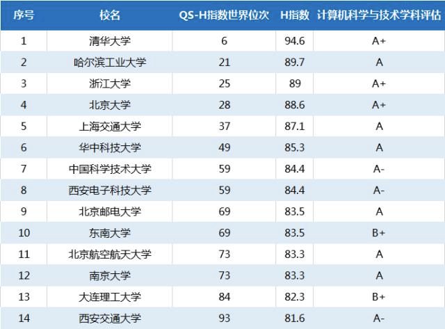 世界范围内具有重要影响力的QS教育组织去年发布了QS世界大学计算机水平H指数,