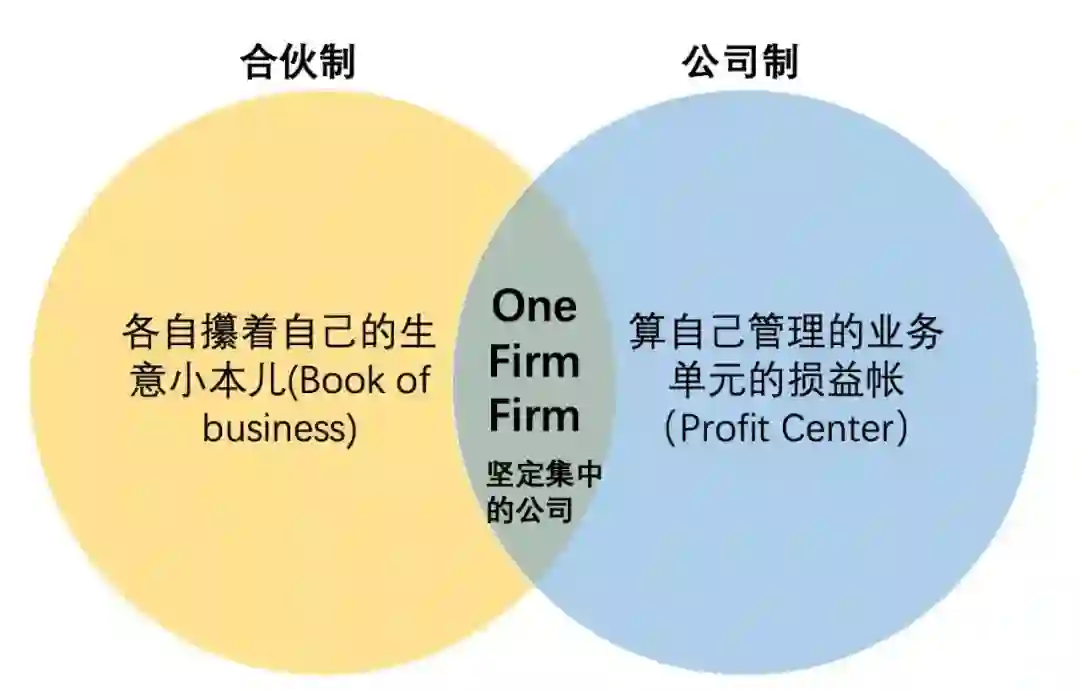 专业服务组织从其诞生开始就是以“合伙制”形式出现(顺便提下,现在国内企业界说的“合伙人制度”,大多数情况下都是指股权和分红激励模式,和合伙制的合伙人是两回事)。法律上,合作制这种组织形态的本质是“人合”,即组织成员之间的信任和合作关系,所有合伙人对公司经营过程中的债务承担无限连带责任,一损俱损、一荣俱荣。只有理念相同、互相信任的合伙人,方能走到一起,这从机制上确保了组织的凝聚力和使命感;同时,这种制度也限制了合伙制公司不能像股份公司或有限责任公司那样,能大量吸收新成员来扩张规模。