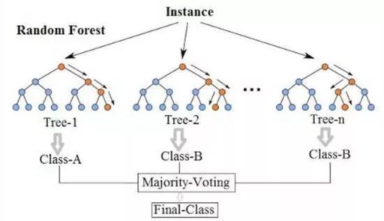 而随机森林则是一座由很多决策树所聚集而成的森林,然后用所有决策树的结果进行投票,得出一个多数的、近似于平均的结果。