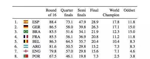 巴西队将在7月15日打败德国,夺得第六个大力神杯。前三夺冠热门队伍按赔率从高到低分别是:巴西18.5%、法国11.3%、德国10.7%。西班牙和阿根廷在1/4决赛被法国与葡萄牙打败,东道主俄罗斯无缘小组出线。