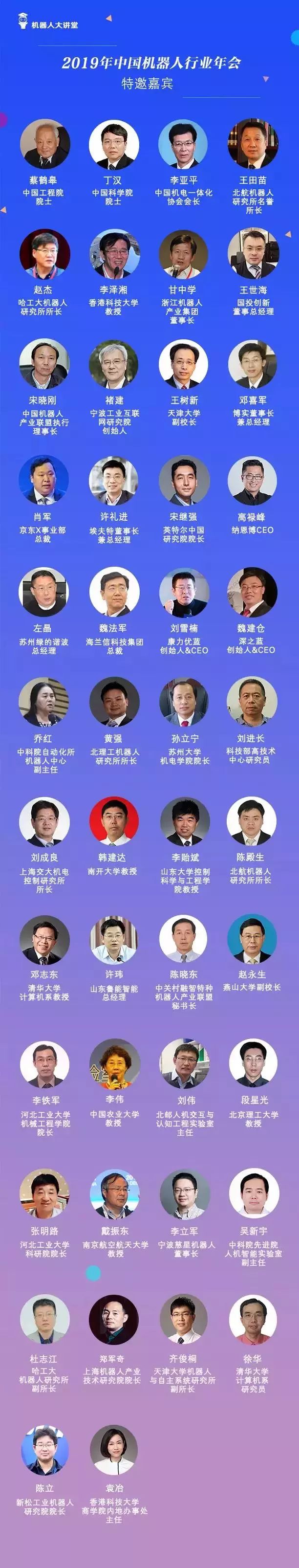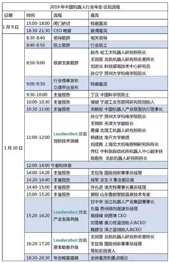 本届年会邀请了行业资深专家、企业家主持,特邀嘉宾围绕“推进机器人产业创新与协作共融”为主题进行,将为在场五百余位行业嘉宾带来关于2018年中国机器人产业发展的深度分享和精彩研讨,为推进2019年中国机器人产业创新与协作共融做好规划。年会初步流程如下,以最终实际流程为准: