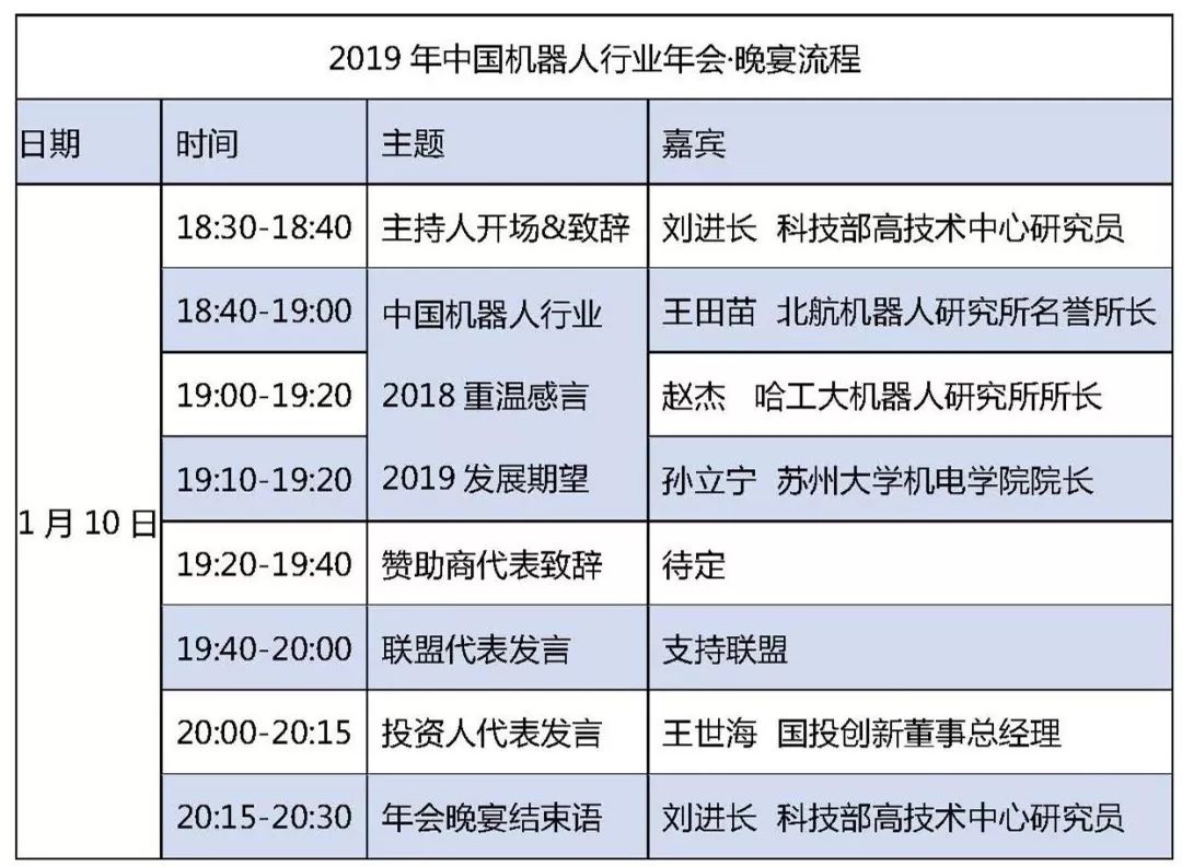 中国机器人行业年会·晚宴盛典将邀请机器人领域内最具国家高度和行业情怀的专家、企业家和投资人发表感言,回首重温2018年机器人行业的进步与成长,展望2019年机器人行业的发展与变革,为在场近二百位晚宴嘉宾奉上行业年会温馨情怀晚宴盛典。晚宴初步流程如下,以最终实际流程为准: