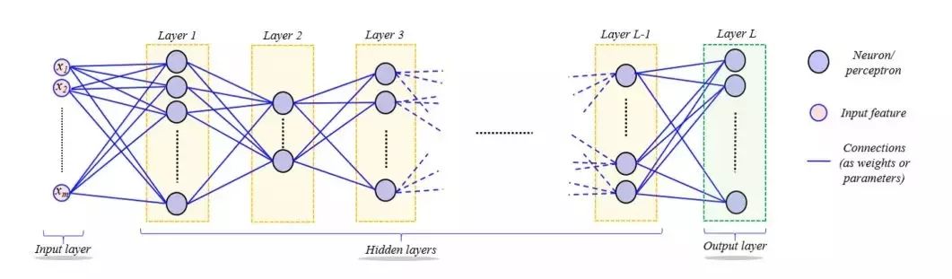 深度神经网络架构,包含输入层、输出层,与多个隐含层。