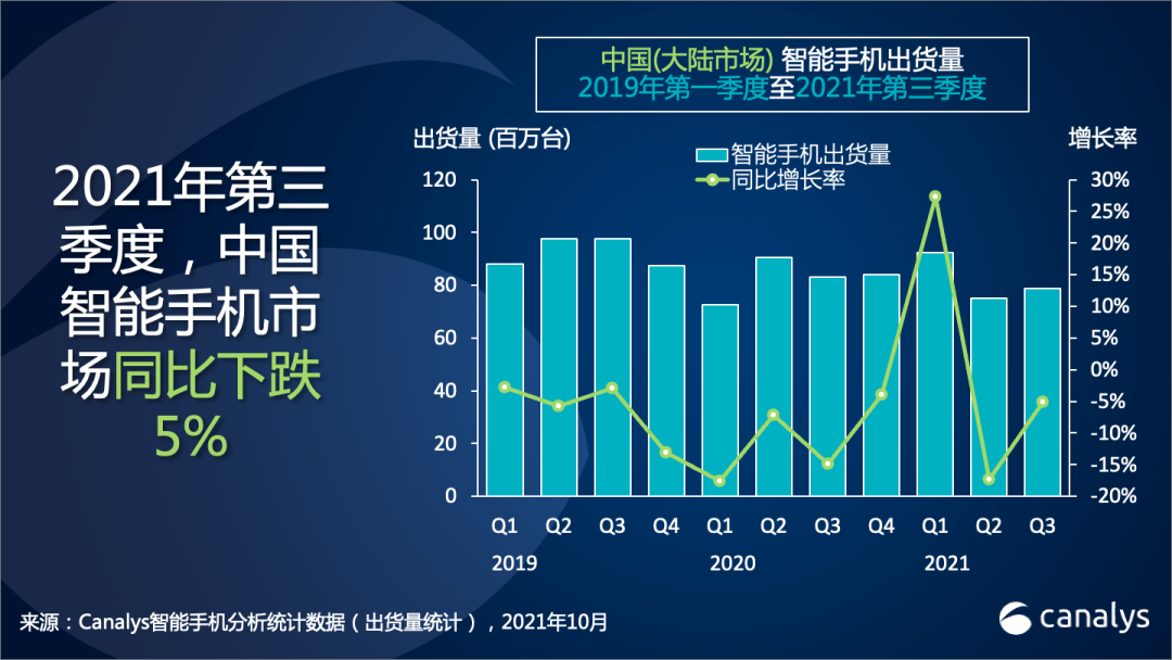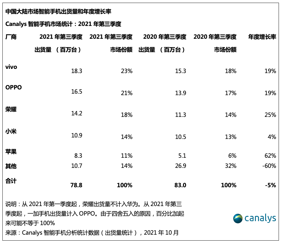 Canalys 今日发布最新数据报告,2021 年第三季度大陆智能手机市场基本恢复与去年同期持平,较第二季度有所回暖,智能手机出货量达到 7880 万部,同比下跌 5% 。vivo 出货量1830 万部位居第一,OPPO(含一加)出货量 1650 万部排在第二,荣耀 1420 万部进入第前三,重返第一梯队,小米、苹果分列四、五位。