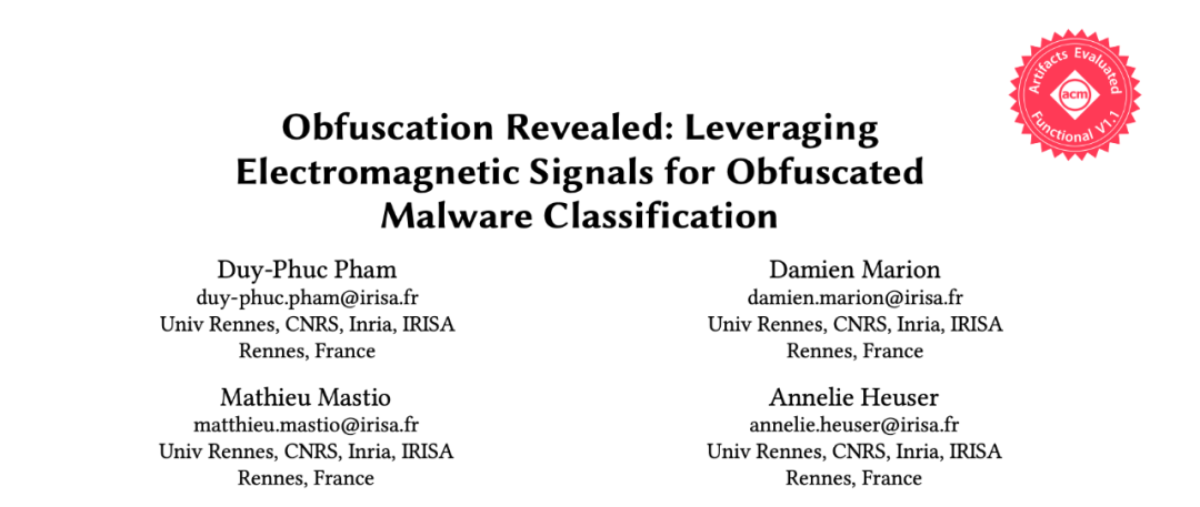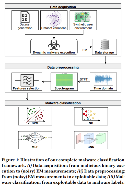 该研究表明,通过使用简单的神经网络模型,可以通过仅观察其 EM 辐射来了解受监控设备的状态,并且可以确定攻击树莓派(运行 Linux OS)的恶意软件类型,在测试数据集上准确率达 99.89%。此外,该研究还证明软件混淆技术不会妨碍其分类方法。这项工作开启了通过电磁辐射进行行为分析的新方向。