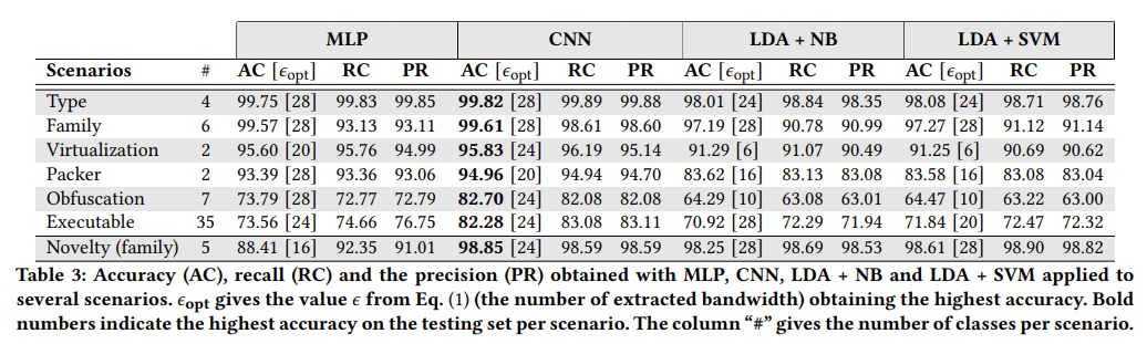 实验结果如表 3 所示。第一列为方案的名称,第二列陈述了网络的输出数量(类),其他列显示了最佳带宽数量的准确性和两个神经网络模型的准确率和召回率,以及测试数据集上的两个机器学习算法。