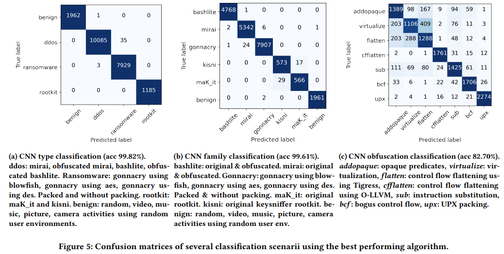 可以观察到,CNN (99.82%)比 MLP、 NB 和 SVM 略准确一些。图 5(a)中显示了每个执行的二进制混淆矩阵的预测类 (预测标签)。颜色越深,正确预测的标签比例越高。良性的 rootkit 类与任何其他类之间没有混淆,双向的 DDos 和勒索软件之间有一点混淆。混淆矩阵如图 5(b) 所示,它表明大部分类型都可被正确分类,并且混淆不会妨碍分类。图 5(c)显示出对于每种混淆技术,CNN 都能预测正确的分类标签。