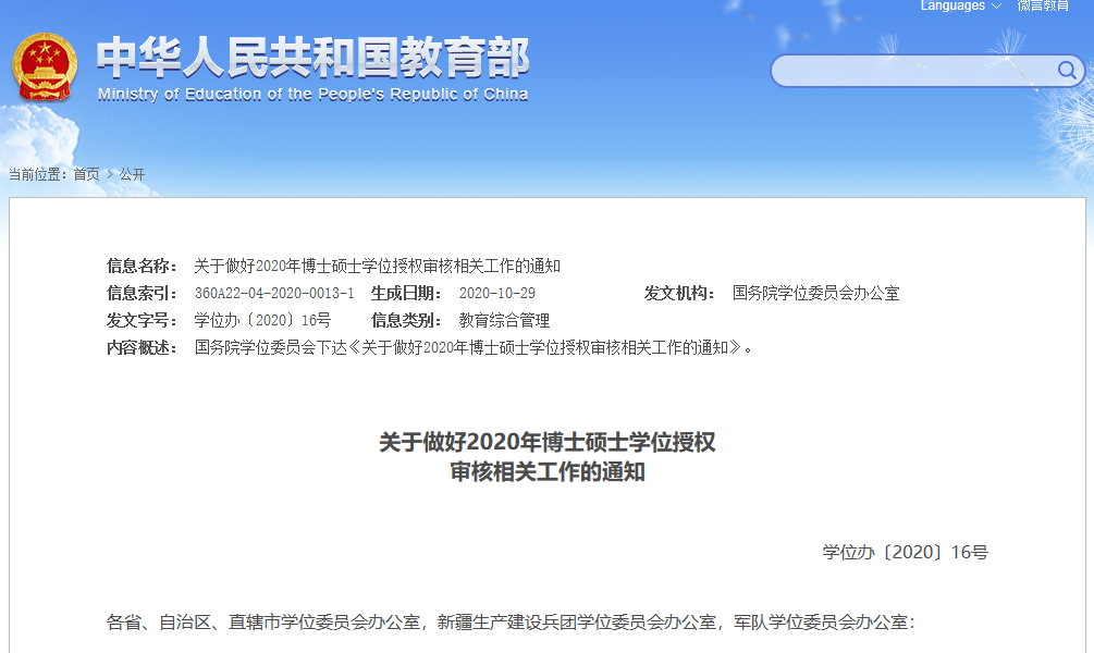 11月5日,教育部官网发布了国务院学位委员会下达的《关于做好2020年博士硕士学位授权审核相关工作的通知》,通知要求2020年博士硕士学位授权审核要做到公开、公平、公正;不得违规降低申请基本条件;同时,应要求本地区(系统)申请单位不得进行任何与学位授权审核工作相关的“公关活动”,不得“跑”“找”评审专家进行请托;申请材料须实事求是,不得弄虚作假。