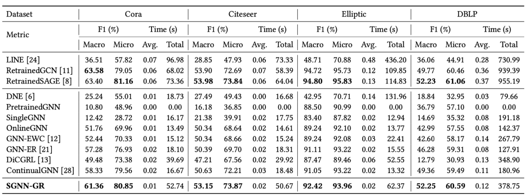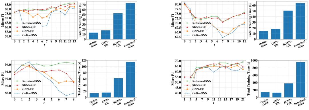 也就是说RetrainedGNN虽然效果好,但是训练复杂度过高,无法在真实的大规模网络上应用。而我们的模型是以增量方式进行训练的,在保持高效迭代的同时,通过额外学习一个设计精巧的生成模型避免了传统增量学习遇到的灾难性遗忘,因此给真实流式场景的应用 提高了一种很好的选择。