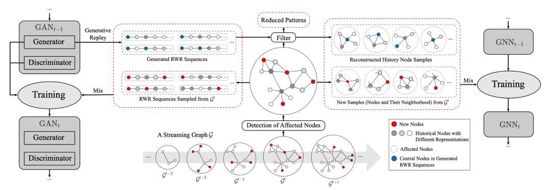 近些年来图神经网络模型在图数据的不同任务上取得了很大进展。然而真实世界的图数据往往是以流式形式存在的,已有一些方法对图神经网络模型进行更新,比如说在每个时间片上对全图进行重新训练,但是会导致很高的计算复杂度;而传统在线学习方法则会导致灾难性遗忘的发生,使得模型无法在全图上有无损的效果。在本文中,我们提出了一种在流式场景下高效地训练图神经网络模型的全新框架,通过一个额外的图生成模型来保存完整的历史分布,使得在图不断变化时模型可以同时学习图中出现的新模式并且巩固已有知识。