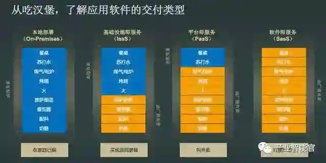 SaaS,就是厂商负责餐桌、烤箱、面团、奶酪等所有物品并烤好披萨,你去披萨店吃。