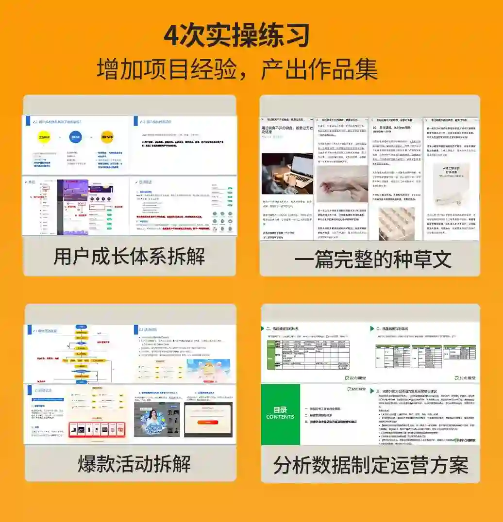 课程专门针对运营人设计,通过10周的线上集训,从【方法论+实操练习+项目实战】三个维度,培养运营人必备的用户、内容、活动、数据四大核心能力。