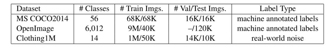 为了测试所提出方法的有效性,我们在三个数据集上进行了实验,包括两个多标签数据集(MS COCO2014 和 OpenImage) 和一个单标签数据集(Clothing1M)。