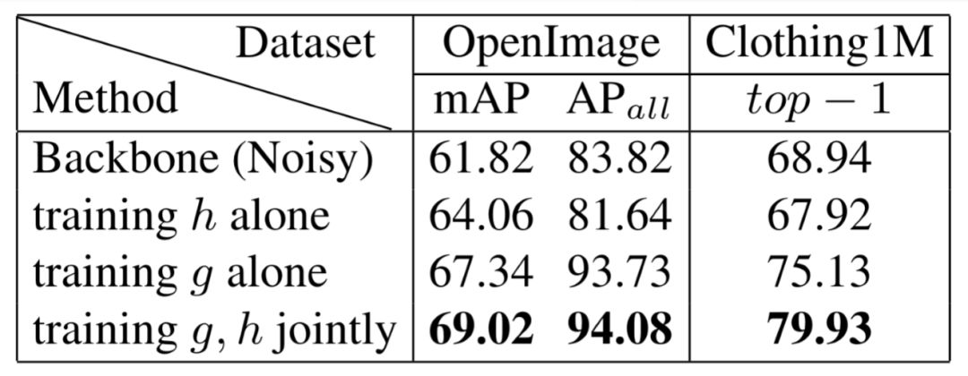 为了显示残差网络的影响,我们比较了不同的训练方式。可以看出,加入残差网络,以协同的方式训练分类器g和h,在OpenImage 和Clothing1M上 可以分别提升1.4%(mAP) 和 4.8% (top-1)。