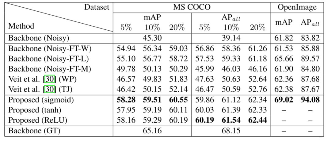 在MSCOCO和OpenImage数据集上,我们分别选取了5%-20%比例的干净标签和全部的人工确认标签作为干净数据集合。可以看出,与基准方法比较,即使干净数据只有5%的比例,我们的方法依然能有较好的性能提升。