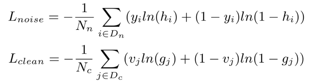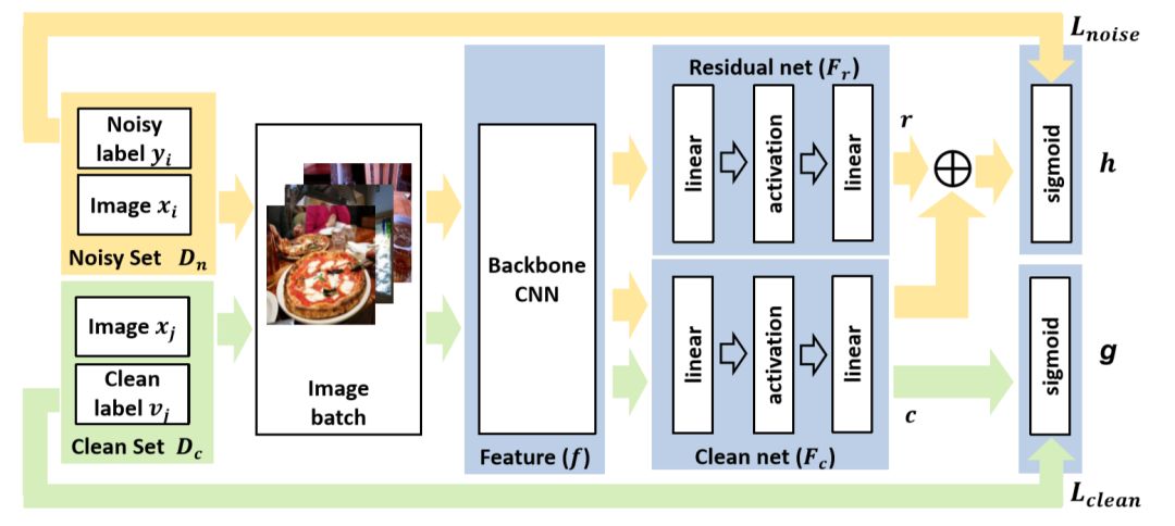 如图所示,我们以多任务学习的方式进行弱监督图像分类,同时训练两个分类器g和h分别拟合干净集合中的干净标签和噪声集合中的噪声标签。主干网络CNN(Backbone CNN)用于学习共享特征。净化网络(clean net)用于学习从特征空间到干净标签空间的映射,残差网络(residual net)用于学习从特征空间到标签残差(干净标签和噪声标签之间)的映射。