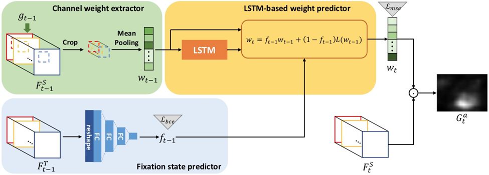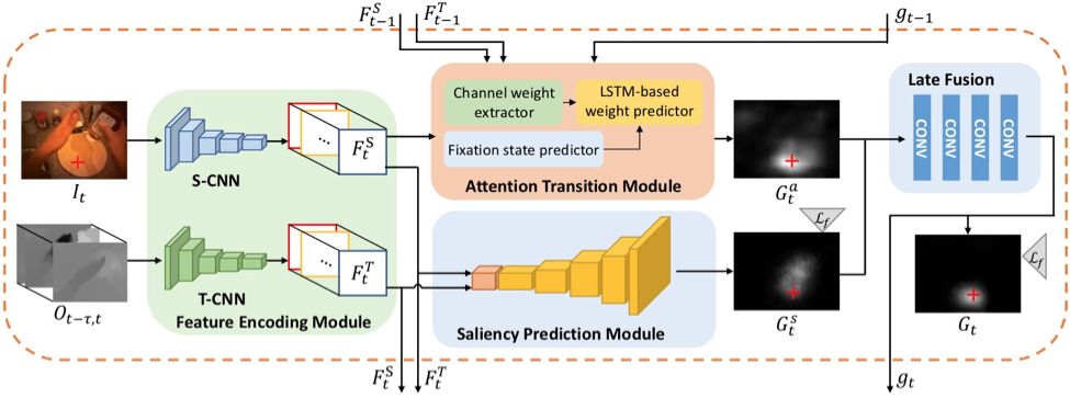 在人与物体的日常交互活动中,人们并不会一直关注视野中显著的区域,而是会根据自己正在进行的任务来调整关注的物体。因此,作为 SP 模块的补充,作者提出了注意转移模块(Attention Transition Module,AT)来对关注物体在时间上的转移过程进行建模,训练时使用一系列视线聚焦时刻(gaze fixation)的注视点作为训练数据。