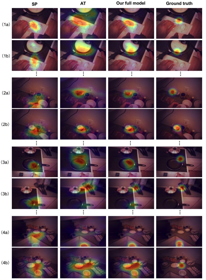 本文提出模型预测得到的注视点的可视化。作者分别展示了显著性预测模块、注意转移模块和完整模型的四组输出 heatmap。每组包含的两张图片分别来自两次连续的注视,其中 a 发生在 b 之前。Ground truth 的 heatmap 通过在注视点坐标周围卷积高斯滤波器得到。由这一可视化结果可以观察到,本文提出的完整模型拥有最接近 ground truth 的预测结果。