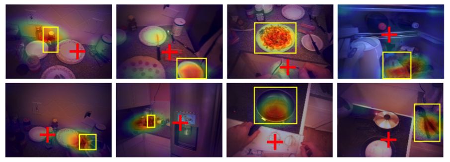 注意转移模块在 GTEA-sub 中部分帧下的定性结果可视化。每张图中都包含了当前帧的注视点(红色十字表示)、基于当前帧模型预测的注视点的 heatmap、注视的基准区域/物体(由黄色矩形框出)。