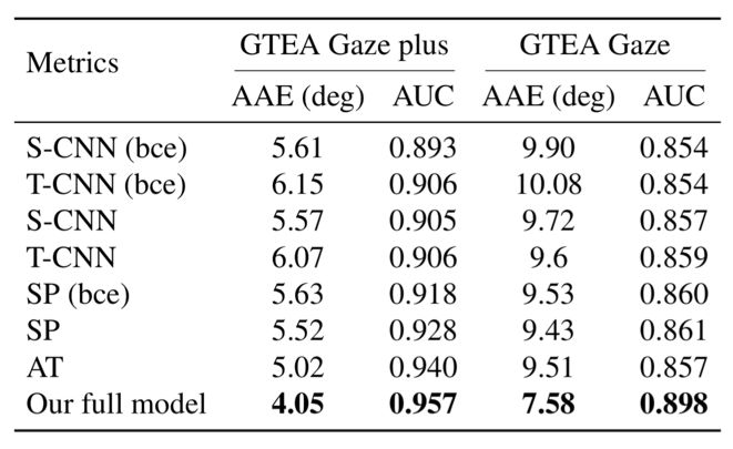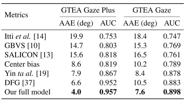 本文使用了两个公开的第一人称视觉数据集:GTEA Gaze 和 GTEA Gaze Plus,来评价所提出的注视点预测模型的性能,并使用 AAE (Average Angle Error) 和 AUC (Area under Curve) 两种评价标准。同时,为了检验模型的注意转移学习能力,本文从 GTEA Gaze Plus 中选取并标注了部分数据(简记为 GTEA-sub)来测试模型是否能够正确的预测注意力的转移。