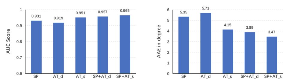 表 2 模型的不同模块在数据集上的表现比较。S-CNN bce 和 T-CNN bce:二元交叉熵(bce)损失函数训练得到的单一 Stream 显著性预测模块;S-CNN 和 T-CNN:作者改进的 bce 损失函数训练得到的单一 Stream 显著性预测模块;SP bce:bce 损失函数训练得到的双 Stream 显著性预测模块;SP:作者改进的 bce 损失函数训练得到的双 Stream 显著性预测模块;AT:注意转移模块。
