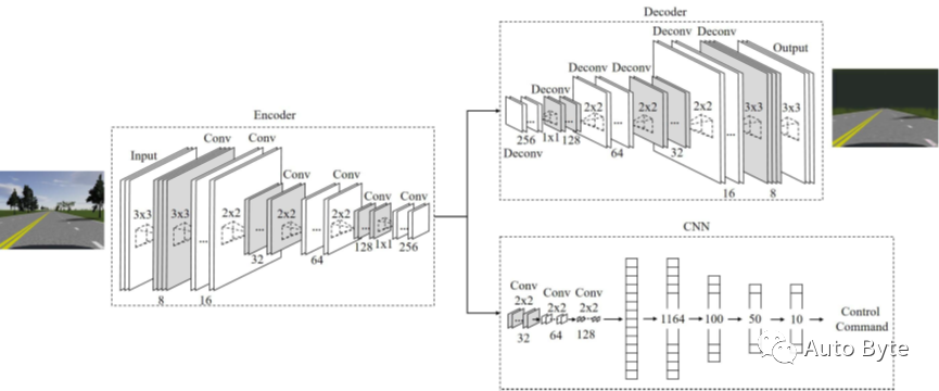 论文作者列出了相应算法的主要思想和基本过程:该系统由自动编码器和自动编码器组成如图1所示。来自前置摄像头的图像作为输入提供给自动编码器。自动编码器由编码器和解码器组成,编码器的输出作为CNN的输入,CNN计算并输出转向角度来控制车辆。