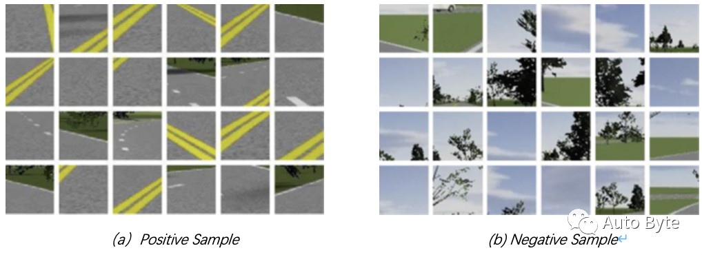 如果图像主要由道路特征组成,则将其归类为阳性样本。另一方面,如果图像主要由树木或天空特征组成,则将其归类为负样本。否则,如果相关特征和不相关特征的比例几乎相同,则丢弃图像。正、负样本集如图4所示。