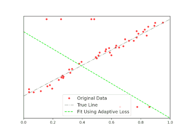 regression = RegressionModel()adaptive = robust_loss_pytorch.adaptive.AdaptiveLossFunction( num_dims = 1, float_dtype=np.float32)params = list(regression.parameters()) + list(adaptive.parameters())optimizer = torch.optim.Adam(params, lr = 0.01)for epoch in range(2000): y_i = regression(x) loss = torch.mean(adaptive.lossfun((y_i — y)[:,None])) # (y_i - y)[:, None] # numpy array or tensor optimizer.zero_grad() loss.backward() optimizer.step()