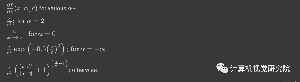 公式 3:鲁棒损失(表达式 1)对于不同的α的值相对于 x 的导数