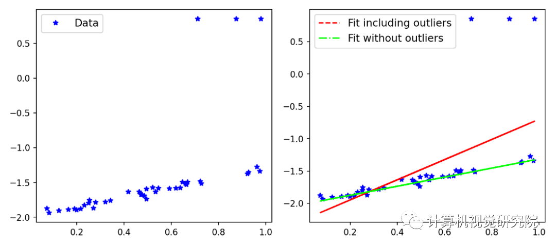 下图为使用Scikit-Learn创建的示例,演示了在有/无异常值影响的情况下,拟合是如何在一个简单数据集中变化的。