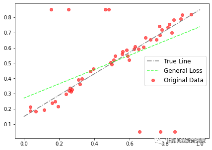 的一般形式和固定α值,可以得到拟合线。原始数据、真直线(生成数据点时使用的具有相同斜率和偏差的线,排除异常值)和拟合线如下图4所示: