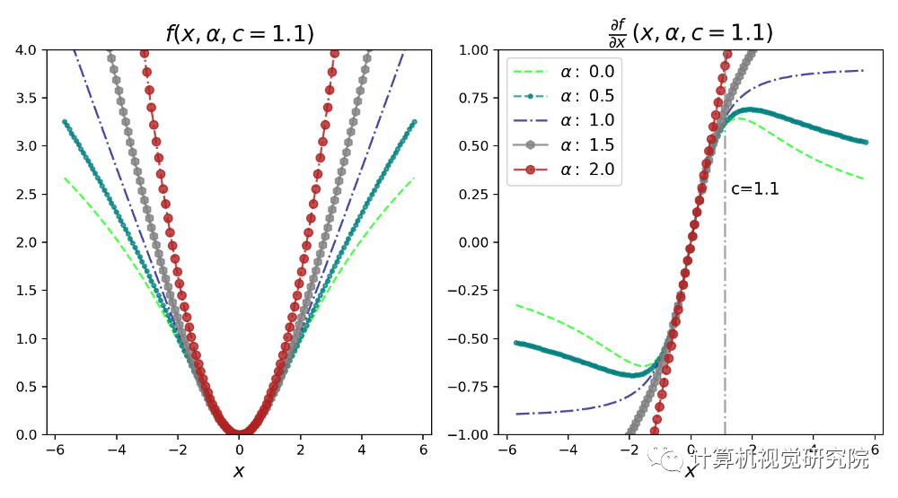 的鲁棒性。c 可以看作是一个尺度参数,在 x=0 邻域控制弯曲的尺度。由于α作为超参数,我们可以看到,对于不同的α值,损失函数