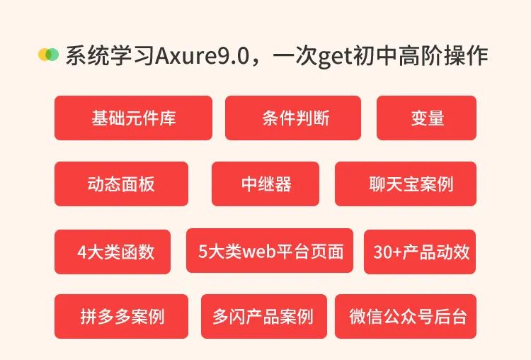 录播部分分 5 大模块,系统学习Axure9.0的所有功能和操作技巧,包括最基础的操作、中继器和动态面板的使用、4大类函数、5大类web页面、30+动态效果、20+产品实战案例等。