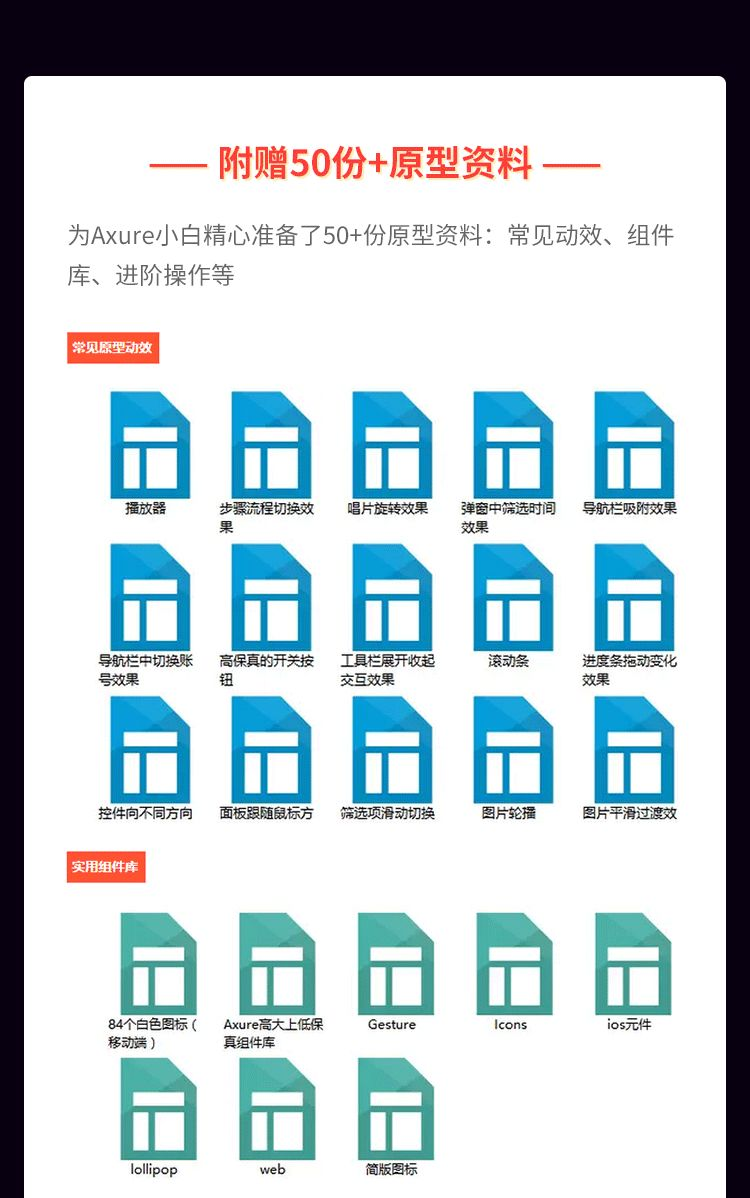 此外,现在报名我们还配套赠送Axure9.0安装包、汉化包、实用浏览器插件,50+原型资料,包括常用元件库、效果与案例等,省去找资料烦恼,切实提高原型效率!
