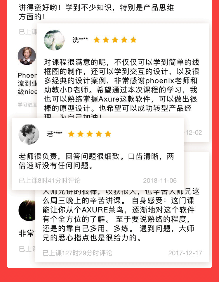 希望通过 80 节录播 + 6 节直播 + 5 次实战,手把手教大家系统掌握Axure原型工具,同时提升交互和产品思维!最终帮助他们逐步摆脱打杂,锻炼深度思考的能力。