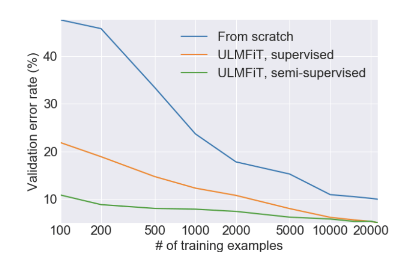只用了100个案例,他们就达到了和用2万个案例训练出的模型同样的错误率水平。除此之外,他们还提供了对模型进行预训练的代码,因为维基百科有多种语言,这使得我们能快速地进行语言转换。除英语之外,其他语种并没有很多经过标记的公开数据集,所以你可以在语言模型上对自己的数据进行微调。