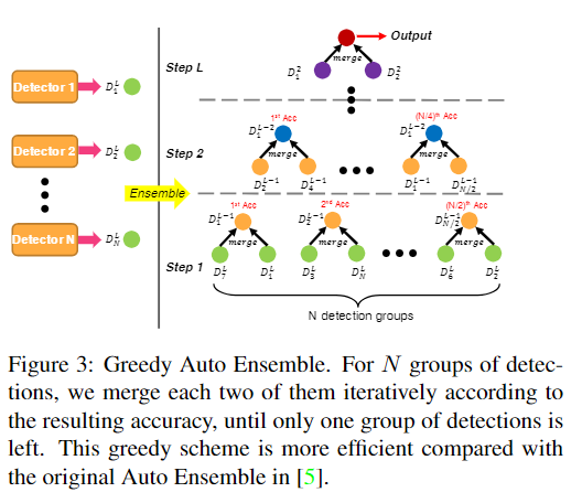 设计了一个贪婪的自动融合方案,它会根据其检测精度自动合并多组检测结果,如图3所示。注意到一组检测代表了从唯一检测器框架或特定检测器生成的检测结果。借鉴了《1st Place Solutions for OpenImage2019 - Object Detection and Instance Segmentation》文章,将每组检测结果视为二叉树的节点。迭代将每对子节点对合并到二叉树的每个层中的一个父节点,直到到达根节点为止,其中根节点用作最终检测结果。不同的是,本方案方法动态并贪心地确定了二叉树的层次关系,从而减少了很多搜索空间。