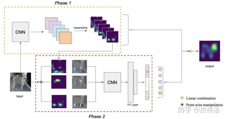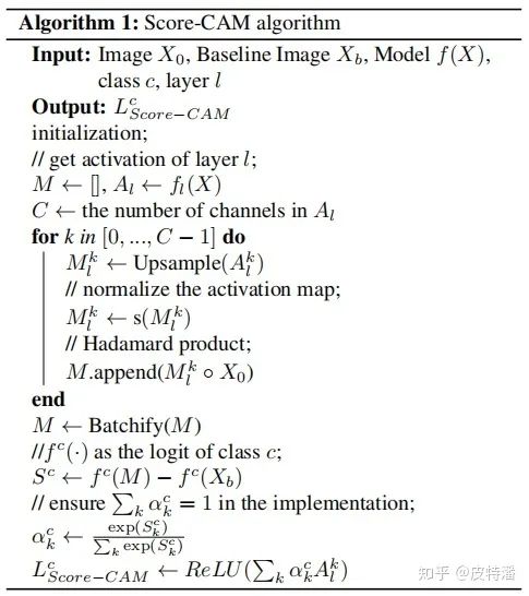 一句话概括就是遍历地将每层特征图置0后再进行网络前向获取目标类别得分, 该值与原始得分的相对大小作为特征图融合权重。论文实验表明, 该方法是优于grad-CAM的.