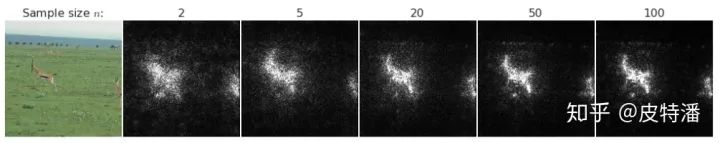 n为对原图增加噪声并前向的次数, 为高斯噪声。可以看到,随着n的增加,噪声逐渐减少,saliency maps逐渐聚焦到目标物体区域。