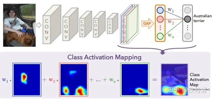 为GAP到输出层全连接到目标类别(上图目标类别为狗)的权重,由于GAP特征向量是直接来自于特征图(线性关系),因此该权重可视为特征图对目标类别score的贡献程度,进行加权求和既可以获取CAM,公式如下: