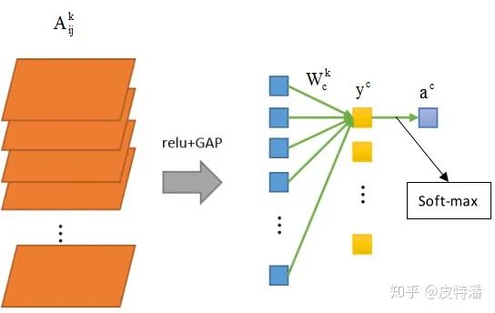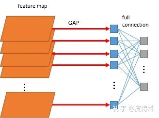 首先介绍一下GAP(Global average pooling,全局平均池化 )操作。参考上图, 这个概念来自network in network,利用全局平均池化获取特征向量,再和输出层进行全连接。GAP直接将特征层尺寸转化成