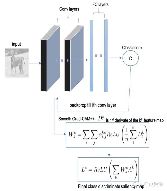 其中c为目标类别, k表示特征图第 k层(或者说第 k个channel), 为该层特征图上的元素位置。可以看出公式中用到了二阶偏导和三阶偏导,计算会更复杂。本文不做详细推导,具体可见论文。